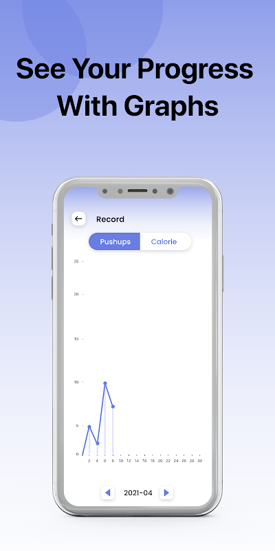 - 개인 트레이너로서 도움이 됩니다. 이 앱은 팔굽혀펴기 횟수를 계산하는 데 도움이 될 뿐만 아니라 소비 중 손실되는 칼로리를 계산하고 일일 소비를 기반으로 그래프를 만듭니다.