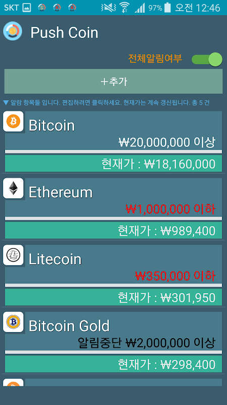 - 알람을 등록하면 등록한 가상화폐의 실시간 데이터를 확인할수 있습니다.