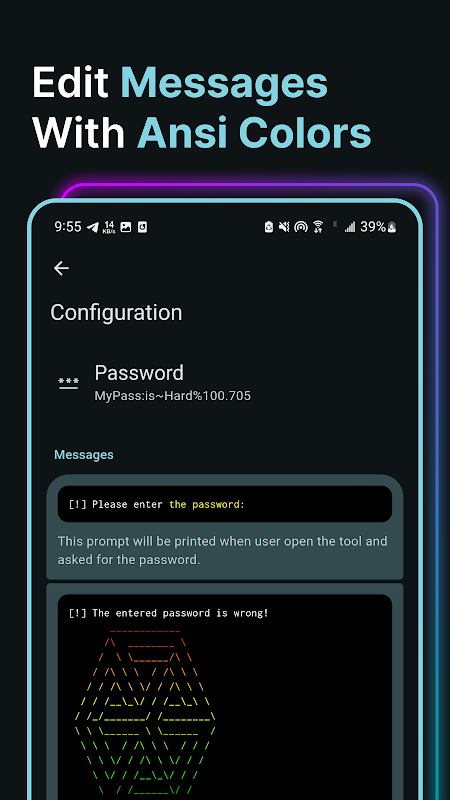 터미널에서와 마찬가지로 ANSI 색상 지원을 통해 터미널 메시지를 미리 보고 편집할 수 있습니다. PyPrivate은 스크립트가 의도한 모양을 유지하도록 보장합니다.