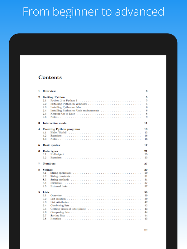 Python Book Offline is a complete book that will guide you from a beginner to a real expert in Python. This Python learning app covers all the basic concepts necessary to develop scripts in Python. No prior knowledge is required. It starts from the basics to build a solid foundation and provides step-by-step instructions on how to write and run scripts. With this Python learning app, you will learn all the basics needed to get the most benefit from this wonderful language.