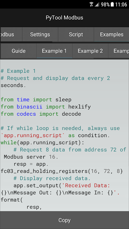 사용자 지정 Python 스크립트를 실행할 수있는 기능을 통해 PyTool Modbus는 수신 된 데이터를 읽고 구문 분석하고 원하는 방식으로 표시하고 필요할 때 그에 따라 작동 할 수도 있습니다.