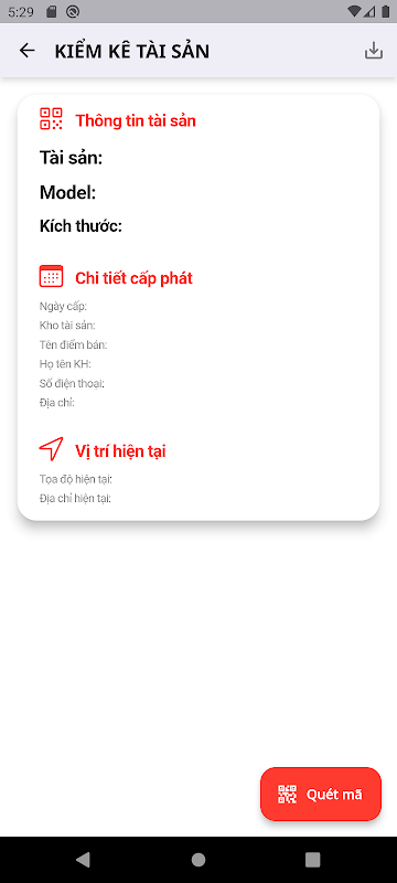 - Ứng dụng được xây dựng để nhân viên trực thuộc công ty kiểm tra các tài sản mà công ty đã cấp cho khách hàng sử dụng ngoài thị trường. Mục đích để kiểm tra, sữa chữa và thay thế tài sản mới cho khách hàng khi có tình trạng hư hỏng xảy ra.