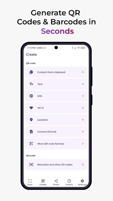 • 다양한 형식: 웹사이트 링크, 일반 텍스트, SMS, 이메일 메시지, Wi-Fi 비밀번호, 캘린더 이벤트, 연락처 정보, 전화번호 등에 대한 QR 코드 생성