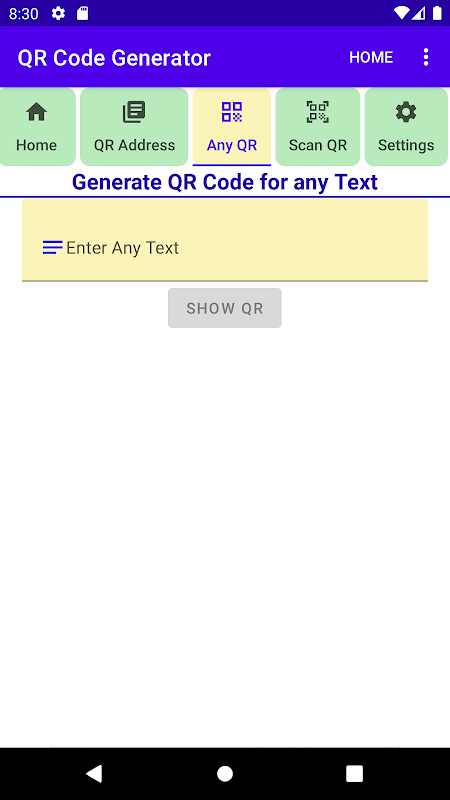 This app will support you to generate a vCard enabled QR Code you can save in the home screen of the app or even save and share it to any friend. You can also scan vCard enabled QR Code or any plan text.