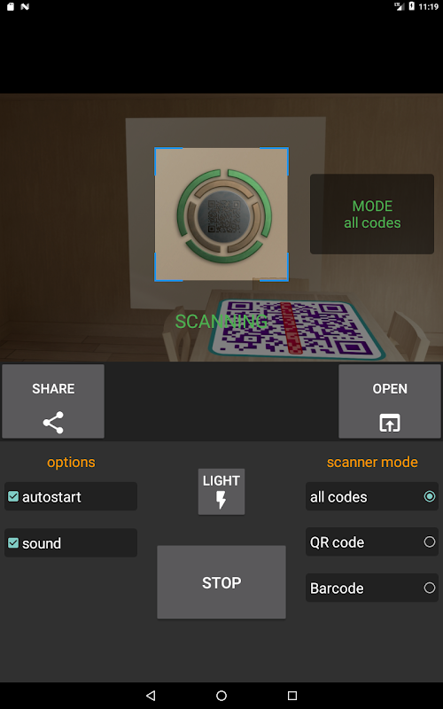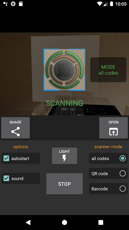스캔 모드 선택기가 있는 QR 코드 스캐너 및 바코드 스캐너