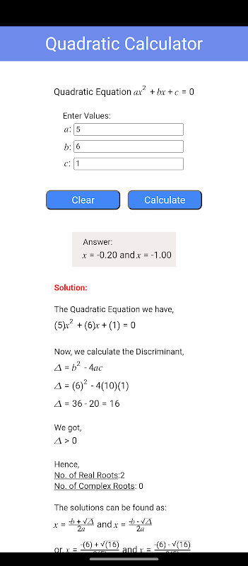 이 앱은 이차 방정식의 실수 및 상상 해를 계산합니다.