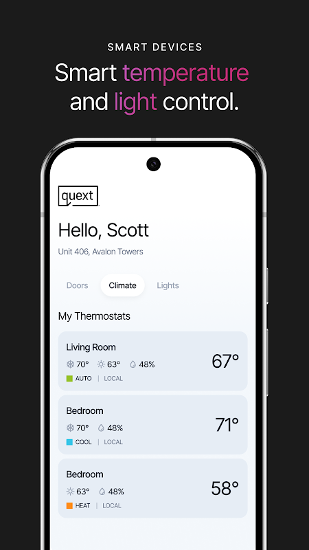 Quext Resident로 스마트 아파트를 완벽하게 제어하세요. 문 잠금 해제, 온도 조절기 조정, 게스트 액세스 관리 등의 모든 작업을 휴대폰으로 쉽게 수행할 수 있습니다.