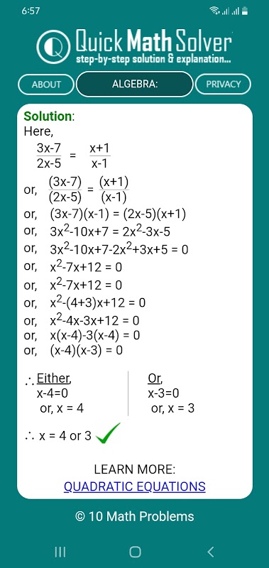 Quick Math Solver는 6~10학년 학생들을 위해 설계된 Android 애플리케이션입니다. 산술, 대수학부터 기하학, 측정, 통계 및 행렬에 이르는 다양한 주제를 다루는 광범위한 수학 문제에 대한 단계별 솔루션을 제공합니다.