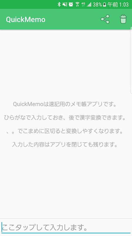 QuickMemo는 속기의 메모장 응용 프로그램입니다. 히라가나로 입력 해 두었다가 나중에 한자 변환 할 수 있습니다.