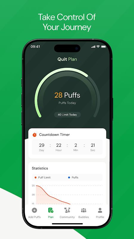 진행 상황 추적 – 베이프를 사용하지 않은 기간, 흡입 횟수, 매일 몸의 느낌이 얼마나 좋아졌는지 확인하세요.