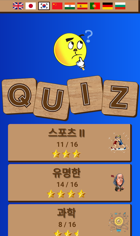 앱에는 다양한 질문 카테고리가 포함되어 있으며, 특정 카테고리를 선택하면 광고 동영상이 시작된 후 질문도 로드됩니다. 각 카테고리에는 "스포츠", "지리" 등과 같은 다양한 주제에 대한 16개의 질문이 포함되어 있습니다. 일부 카테고리에서는 플레이어가 질문에 올바르게 대답하면 추가 정보를 받습니다. 플레이어가 모든 질문에 답한 후 정답 비율에 따라 별을 얻습니다.