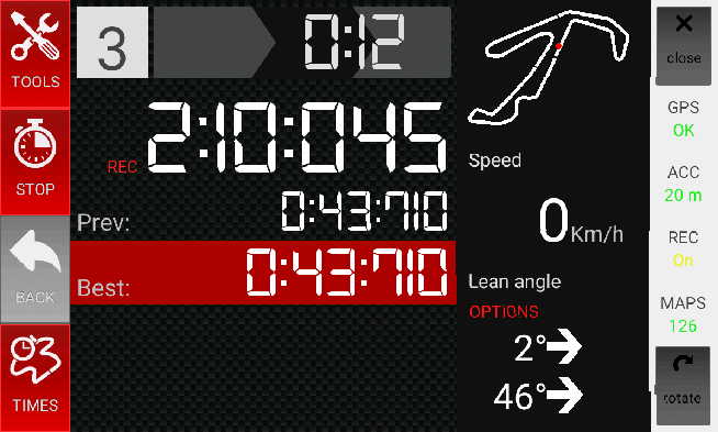 GPS 랩 타이머, 추적기 및 원격 측정. 기록 속도, 경사 각도 및 G-Force
