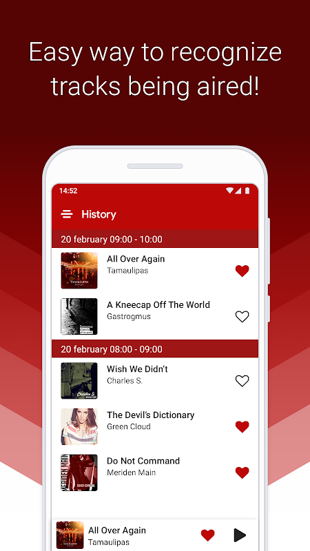 당신은 시작할 수 있습니다 • / 스트림을 일시 중지 각 화면에 즐겨 찾기 목록에 트랙을 추가 할 수 있습니다.