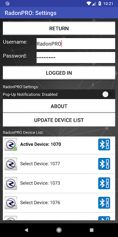 The RadonPRO Mobile Application for Android enables a wireless connection to your RadonPRO monitor using Bluetooth on your smartphone or tablet. Start tests and download data wirelessly from your Android Phone or Tablet without an Internet Connection.