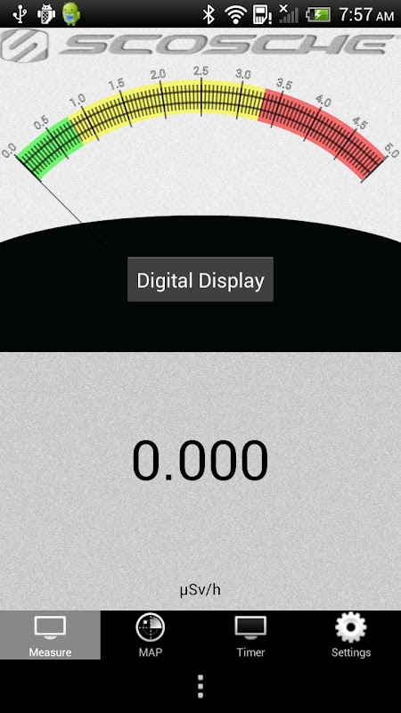 The radTEST App is a radiation detection application designed to work exclusively with the RDTX pro from Scosche. Along with the RDTX pro, radTEST empowers you to detect gamma radiation levels with your Android device* so that you can take control of your well-being. The easy-to-use Meter Display indicates radiation levels are indicated as being safe, elevated or dangerous. For advanced users, the Digital Display shows detailed radiation measurements. Share your results with your friends around the globe and take control of protecting your world.