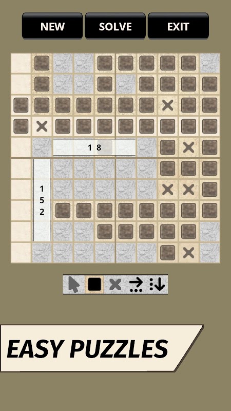 각 행과 열이 레이블 안내선에 표시된 대로 올바른 길이의 범위가 되도록 그리드에 블록을 배치하여 퍼즐을 풉니다. 제거한 셀을 기억하는 데 도움이 되도록 격자에 십자형을 배치할 수도 있습니다. 그리드를 터치할 때마다 퍼즐은 해당 행과 열을 강조 표시하고 포함해야 하는 범위를 보여줍니다. 화살표 도구를 사용하여 셀을 수정하지 않고 그리드를 조사하고, 블록 도구를 사용하여 블록을 켜거나 끄고, 십자 도구를 사용하여 긋습니다. 다음 두 도구는 행이나 열의 나머지 빈 셀을 현재 선택 항목으로 채웁니다(화살표+채우기는 셀을 지웁니다). 마지막 도구는 모든 행과 열에 대한 힌트를 표시하는 반투명 레이어를 도입합니다.
