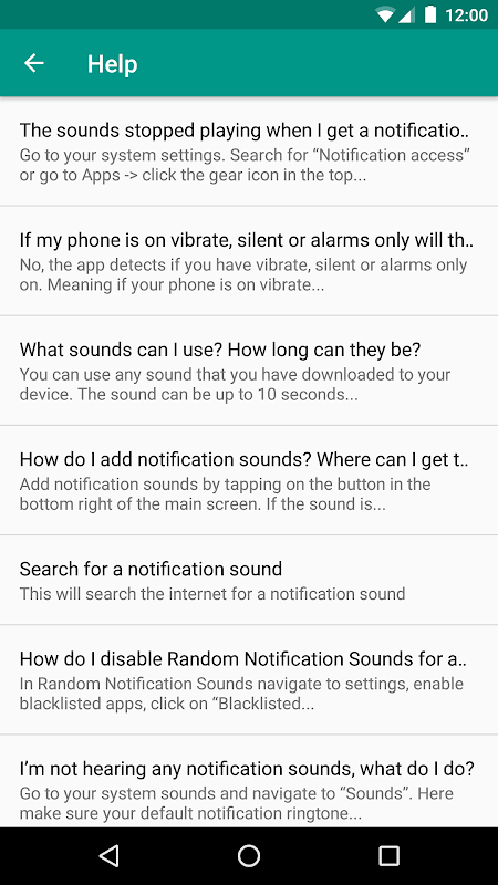 그것은 어떻게 작동합니까? 당신이 통지를받을 때, 응용 프로그램은 무작위로 선택한 소리 그러나 많은 통지를 선택할 것입니다. 당신은 당신이 원하는 사운드 파일을 추가 할 수 있습니다, 단순히 알림 음을 다운로드하고 응용 프로그램에서 해당 한 쉽게, 선택! 앱은 무작위로 통지 분리되고 싶어? 간단하게 소리 또는 해당 응용 프로그램에 설정 한대로, 이제 응용 프로그램은 알림을 사용 설정으로 이동하고 응용 프로그램을 블랙리스트! 휴대 전화 등 침묵, 진동에있는 경우 응용 프로그램이 자동으로이를 인식하고 당신을 방해하지에 따라 임의의 소리를 꺼집니다. 당신이 우선 순위 알림 만 만 알림을 만들 것입니다 응용 프로그램에 소리가있는 경우 (안드로이드 사탕 이상에서) 알림 우선 순위가 애플 리케이션을위한 소리 알림 우선 순위의 의미를 존중합니다.