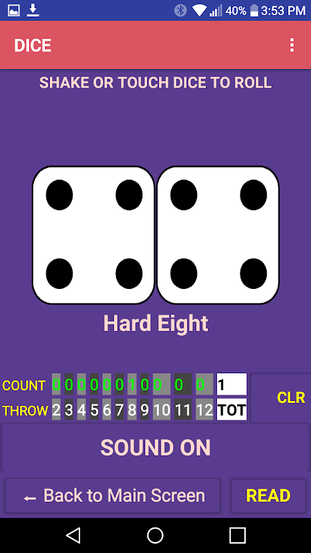 DICE, as the name implies, animates randomly throwing two dice. If the sound is turned on, it will call out the common name for the combination (snake eyes, etc.) Also, DICE keeps track of the number of times any particular combination is thrown.