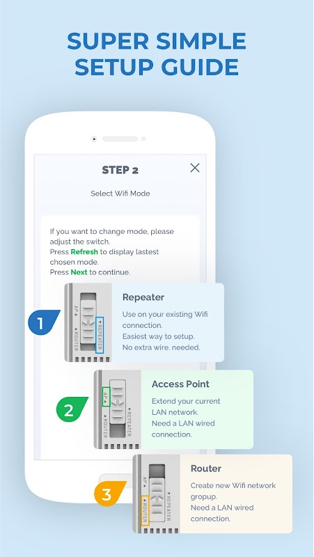- 3가지 라우터 모드 지원 - RangeXTD WIFI 익스텐더에서 리피터 모드, AP 모드 및 라우터 모드 중에서 선택하고 앱으로 쉽게 설정