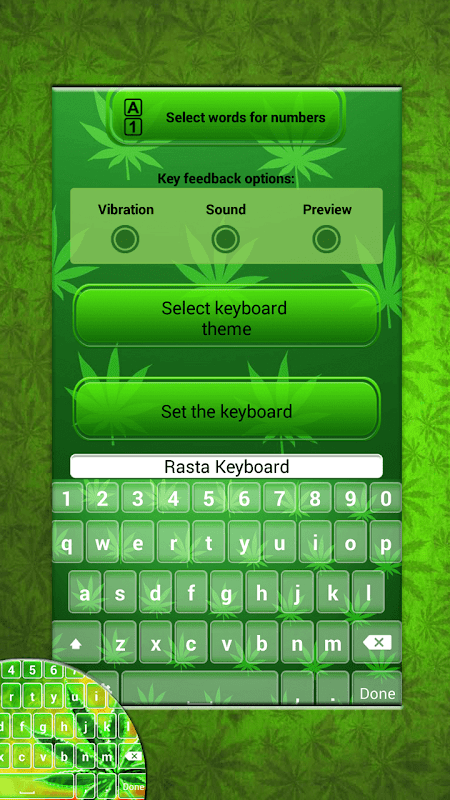 모든 친구에게 멋진 "키보드 앱 '을 보여주고 생명을 enoy! 마리화나 연기가 재미 쿼티 키보드 휴대 전화 또는 태블릿 화면에 경이로움을 만들어 보자! 최고의 SMS 문자 메시지 앱은 입력이 쉽고 더 나은 만들기 위해 여기! 그림 이모티콘 무료 rasta의 키보드 테마를 설정하고 친구들과 메시지를 문자 메시지 즐길 수 있습니다.