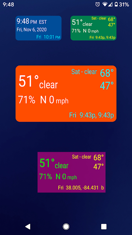 If location permissions are not set or location or GPS services are not enabled, an error line ("X permission" or "X location" for example) will be displayed and there will be no location/weather updates.