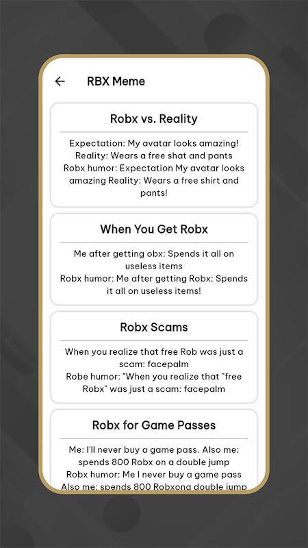 이 앱은 Roblox Corporation과 관련이 없습니다. 무료 Robux를 제공하거나 Robux를 생성하거나 실제 통화를 수집하지 않습니다. RBX 팬이 가상 가치를 추정할 수 있는 엔터테인먼트 도구입니다.
