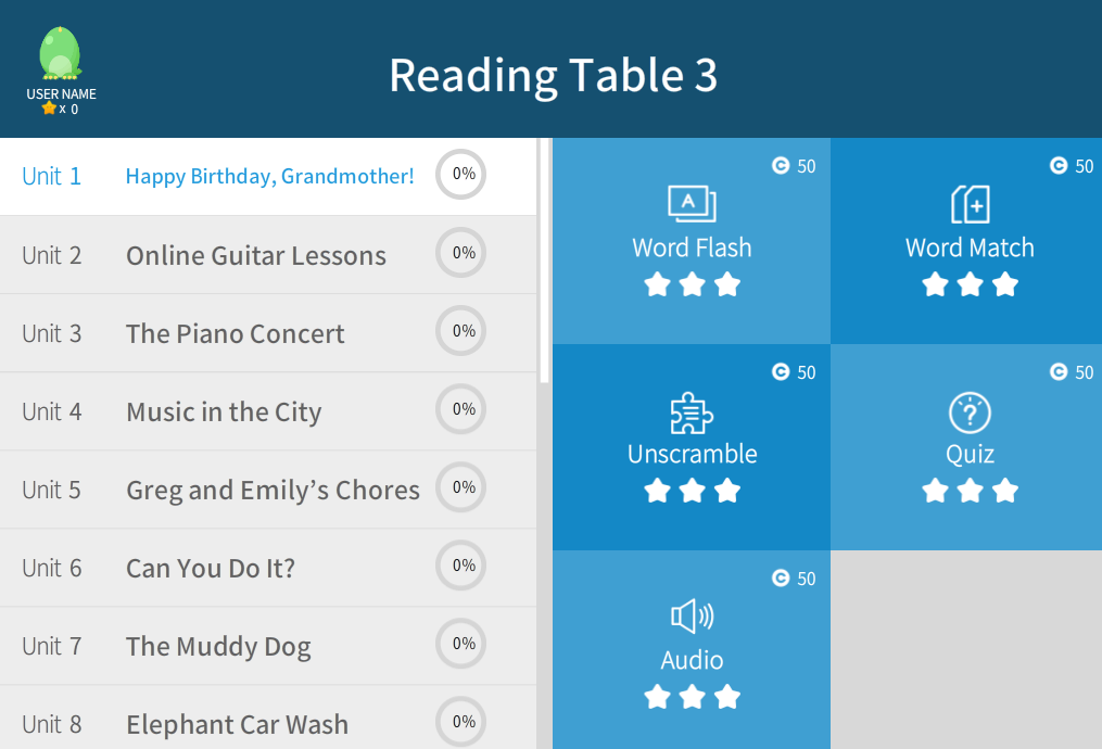 Reading Table은 총 3권으로 구성된 리딩 교재로서, 초등 초중급 수준의 학습자들을 위한 교재이다.