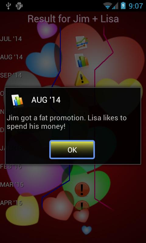 Ask the free Relationship Analyzer, if you are going to stay together forever, of if your partner is going to cheat on you in the next months. Or maybe you will get engaged or get a child? Who knows?