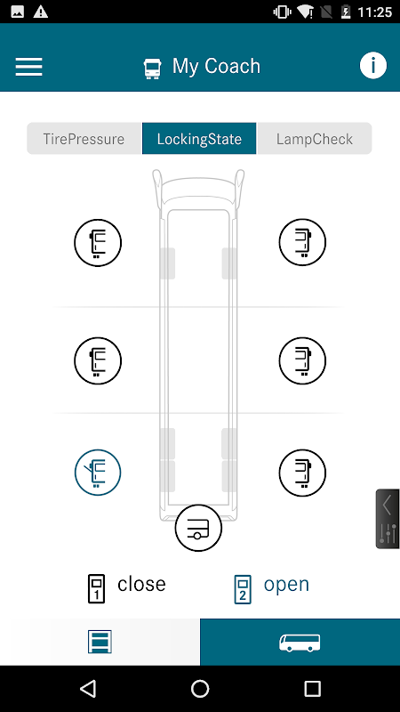 The Remote Bus App displays current vehicle data to the user. Further on exclusive vehicle functions can be controlled. Monitore: -Total Kilometer -Engine Hour -Fuel Level -Adblue Level -Outside Temperature -Inside Temperature -Brake Pressure1 -Brake Pressure2 -Tire Pressure -Tire Temparature -Tire Sensor Battery Status -Flap and Doors State Control: -Lampcheck -Independent Heating -Interior Light. Connection: WIFI, Range: 25m around the vehicle