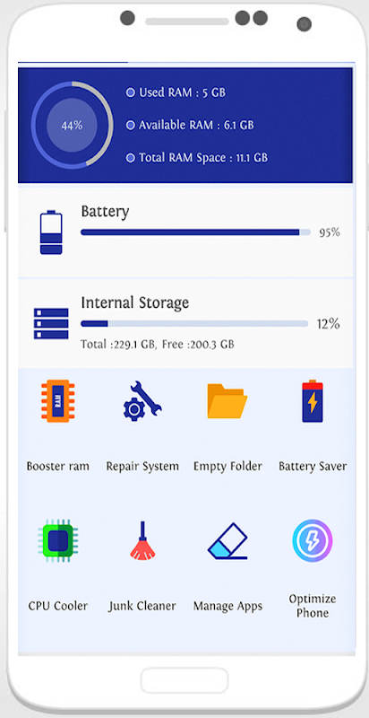actually, by installing our app, you get Five tools in 1 app, RAM Cleaner or RAM Booster, Repair System Phone, Optimize Operating System, With the possibility to remove any applications and remove remnants of the application that has been uninstalled.