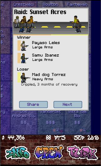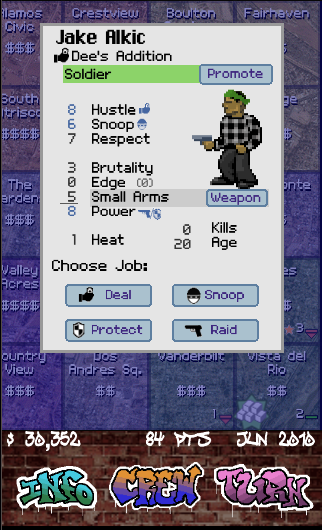 Respect is a tactical game of keeping one step ahead of your enemies. You manage your soldiers, upgrade your weapons, and compete for the best corners in the city. Use spies to track down your rivals' stash houses, bolster your defenses with heavy weaponry and send your hardest soldiers to execute unexpected raids. But don't forget to keep an eye on your own men; out on the streets, RESPECT is everything and disloyalty is your greatest enemy. If a soldier steps out of line, you need to respond. Settle disputes, promote lieutenants, throw lavish parties, track down valuable rumors, intimidate snitches and keep off the heat with crooked lawyers to protect your crew.