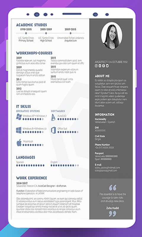 1. CV Maker 완벽한 PDF 템플릿 형식의 이력서 작성기 및 편집기 프로 응용 프로그램은 사진과 사진없이 20 개의 전문적이고 인상적인 이력서 템플릿을 가지고 있습니다.