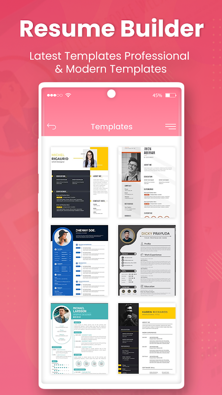 Professional Resume Builder - CV 이력서 템플릿 앱은 더 신선하고 경험이 풍부한 사람을 위한 것입니다. - 엄선된 무료 이력서 템플릿을 사용하여 몇 분 안에 최고의 전문 이력서를 만드십시오. 이 CV 메이커 앱으로 현대적이고 전문적인 이력서와 커버 레터를 만드십시오.