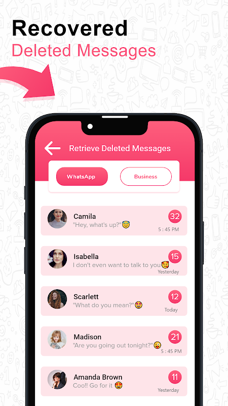 삭제된 메시지 백업 및 복구, 복구로 삭제된 WhatsApp 메시지 참조. 보내지 않은 메시지 메신저를 읽고 WhatsApp에서 상태를 다운로드하십시오.