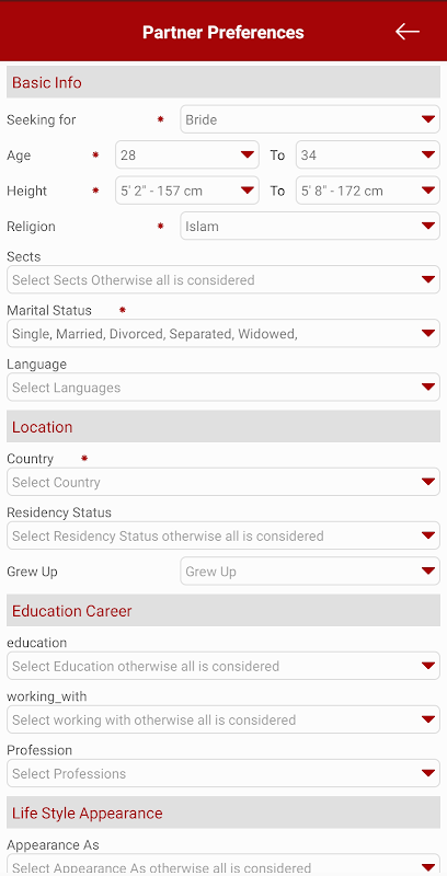 Shaadee.pk에서는 배경, 종교, 인종, 민족, 지리적 지역 또는 연령대에 관계없이 존경받는 후보자를 수용합니다.