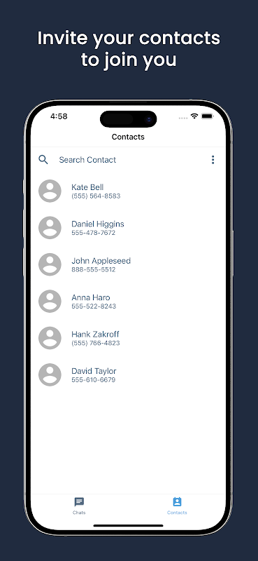 RNChatt는 쉽게 연결을 유지하도록 설계된 혁신적인 메시징 앱입니다. 장치 연락처를 원활하게 가져오고 앱에 이미 등록된 사용자를 식별하여 즉시 메시징을 시작하세요. 아직 앱에 없나요? 탭 한 번으로 초대장을 보내세요!