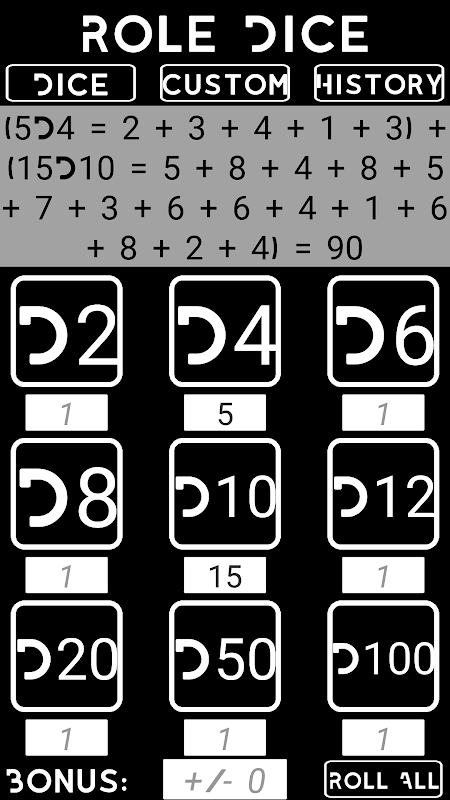 -기본 주사위 : D2, D4, D6, D8, D10, D12, D20, D50 및 D100.