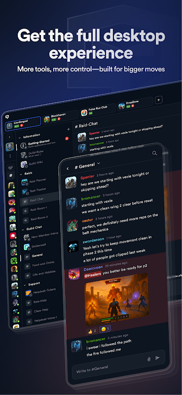 손쉬운 탐색 및 멀티태스킹 - 커뮤니티 간 전환, 온라인 상태 확인, 친구, 멘션 등으로 알림 필터링 등이 가능합니다.