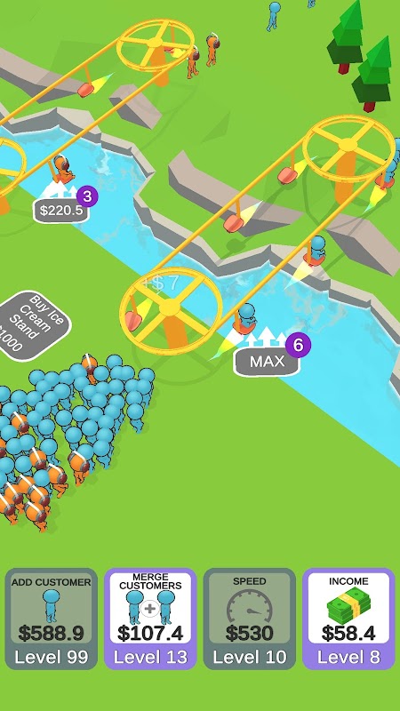 더 많은 사람을 수송하고, 새 건물을 잠금 해제하고, 더 나은 건물로 병합하세요. 더 많은 비용을 지불하는 고객에게 서비스를 제공하려면 VIP 섹션을 업그레이드하세요. 새로운 좌석을 잠금 해제하고, 새로운 로프웨이 역을 건설하고, 식료품점, 아이스크림 부스, 피자 가게와 같은 작은 상점을 여세요.