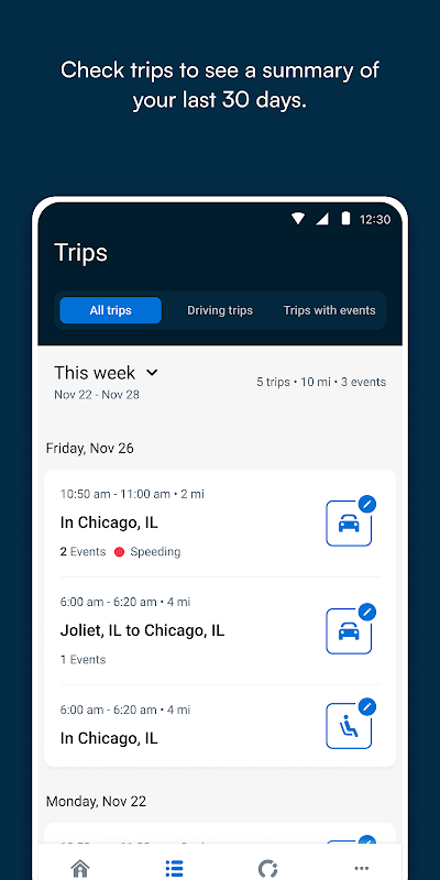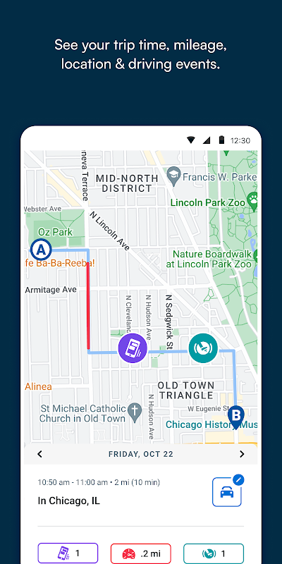 앱을 열기만 하면 여행 및 운전 데이터를 모니터링할 수 있습니다. 개별 여행의 상세한 지도를 검토하여 주행 거리와 빈도, 그리고 도중에 발생할 수 있는 과속, 급제동 또는 주의 산만 운전 상황을 이해할 수 있습니다.