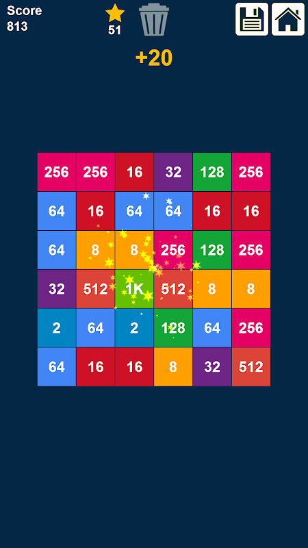 Just drag rows and columns to match 3 or more same adjacent numbers. Then, they will be removed from the board. The numbers are the repeated multiplication of number 2 [2, 4, 8, 16, 32, 64, ..., 1024, 2048, ...].