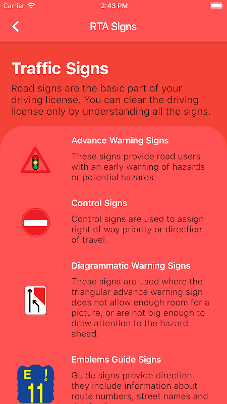 RTA 신호 테스트 اسارات السير 앱은 실기 테스트를 통과하기 위해 이해해야 하는 모든 교통 표지판을 제공합니다. RTA 신호 테스트의 모든 문제와 답변을 연습할 수 있습니다. 각 표지판에 대한 자세한 설명이 있습니다. 교통 표지판을 통과한 후 RTA 신호 테스트 연습을 해 보세요.