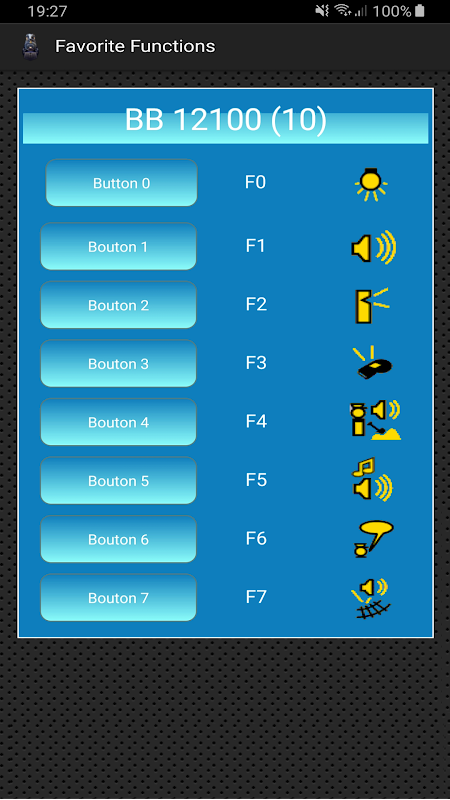 메인 스크린에서 기관차의 기능을 관리하는 8 개의 즐겨 찾기 단추가 있습니다. 각 버튼과 각 기관차에 대해 0에서 31까지 기능을 설정할 수 있습니다.