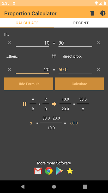 이 응용 프로그램은 세 개의 알려진 값을 입력하고 "계산"을 눌러 비율 (직접 또는 간접)을 계산합니다. 앱이 누락 된 값을 계산합니다!