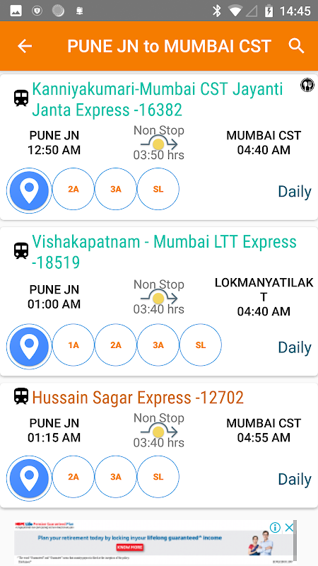 Once you will tap on search trains, the app will show you the full list of trains between your desired location and destination. To find out the current status of train berth availability, you can simply tap on the displayed class of coach. When you click on your desired coach class, the App will display information like average speed of train, train structure or composition of train. You can select fare and availability of seats from the top three options to check fair and status of seat availability.