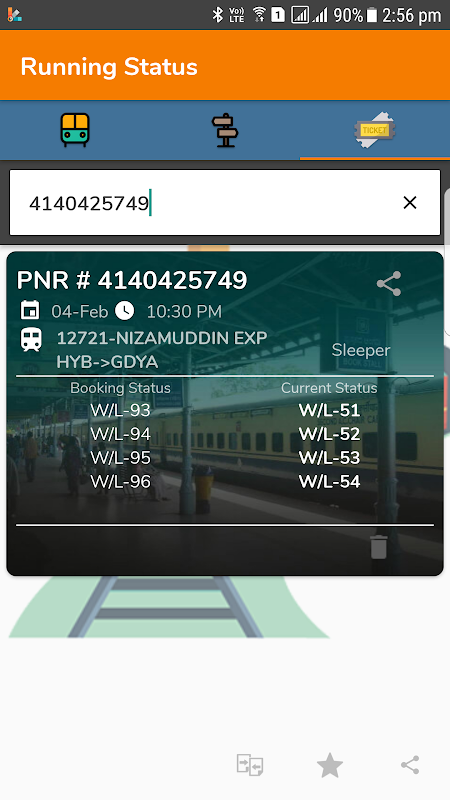 Once you install and open this App, a very simple interface will pop in front of you. On the top of it you can see 3 icons. By default this app will open on the first icon in which you can simply enter your - train number / train name to enquire or check your current train running status and schedule. Once you will enter the first three digits of your train number or train name the App automatically shows you suggestions pertaining the details of your train. From the list and you can choose your train and the moment you will tap on your train details it will ask you to select the date of which you want to know the running status of your train. As you select your desired start date of the train for which you want check the running train status for, you can easily spot your train and get the current train position and how much time it will take to arrive on your destination. You will also be notified of rescheduled timings of your train if any.