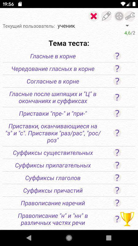 응용 프로그램은 다양한 주제에 대한 러시아어의 철자와 구두점 테스트입니다. 일반 테스트를 실행하여 선택한 주제와 한 번에 모두 테스트 할 수 있습니다. 시험을 통과하면 실수를 확인하고 러시아어의 관련 규칙을 연구 할 수 있습니다.