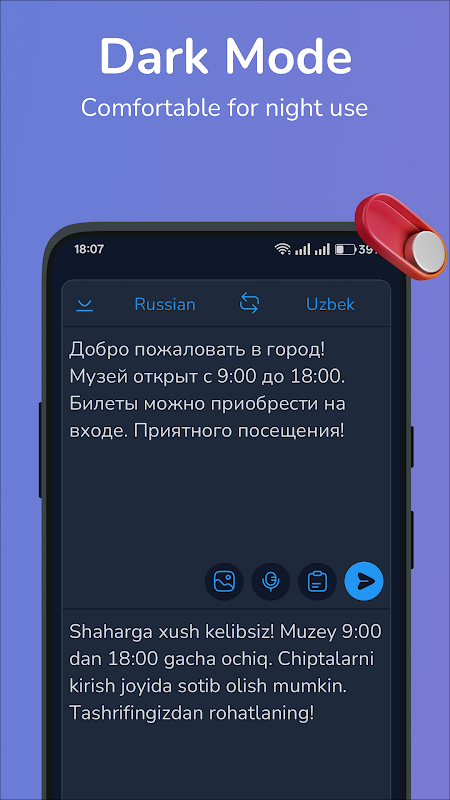 - 자연 음성 인식: 자연스럽게 말하고 우즈베크어 또는 러시아어로 완벽한 번역을 받으세요.