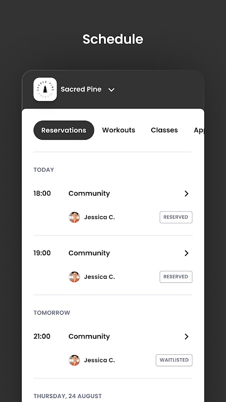 Sacred Pine 회원이 수업에서 자신의 자리를 예약하고, 체육관 행사에 등록하고, 등록된 얼굴 사진 및 신용 카드 업데이트와 같은 일반 계정 관리를 위해.