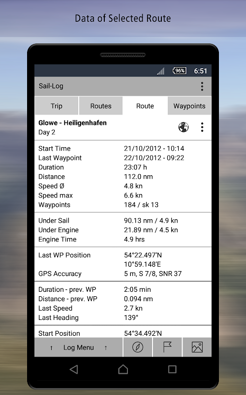 ➤ Sail-Log는 장치의 GPS 수신기를 사용하여 여행 경로를 추적합니다. 웨이포인트는 분 단위로 설정된 사용자 정의 간격을 사용하여 수동으로 또는 자동으로 가져옵니다. 따라서 이 앱은 배터리 전력을 거의 소모하지 않도록 설계되었습니다. Sail-Log는 추적 모드도 제공하므로 움직임을 초 단위로 기록할 수 있습니다.